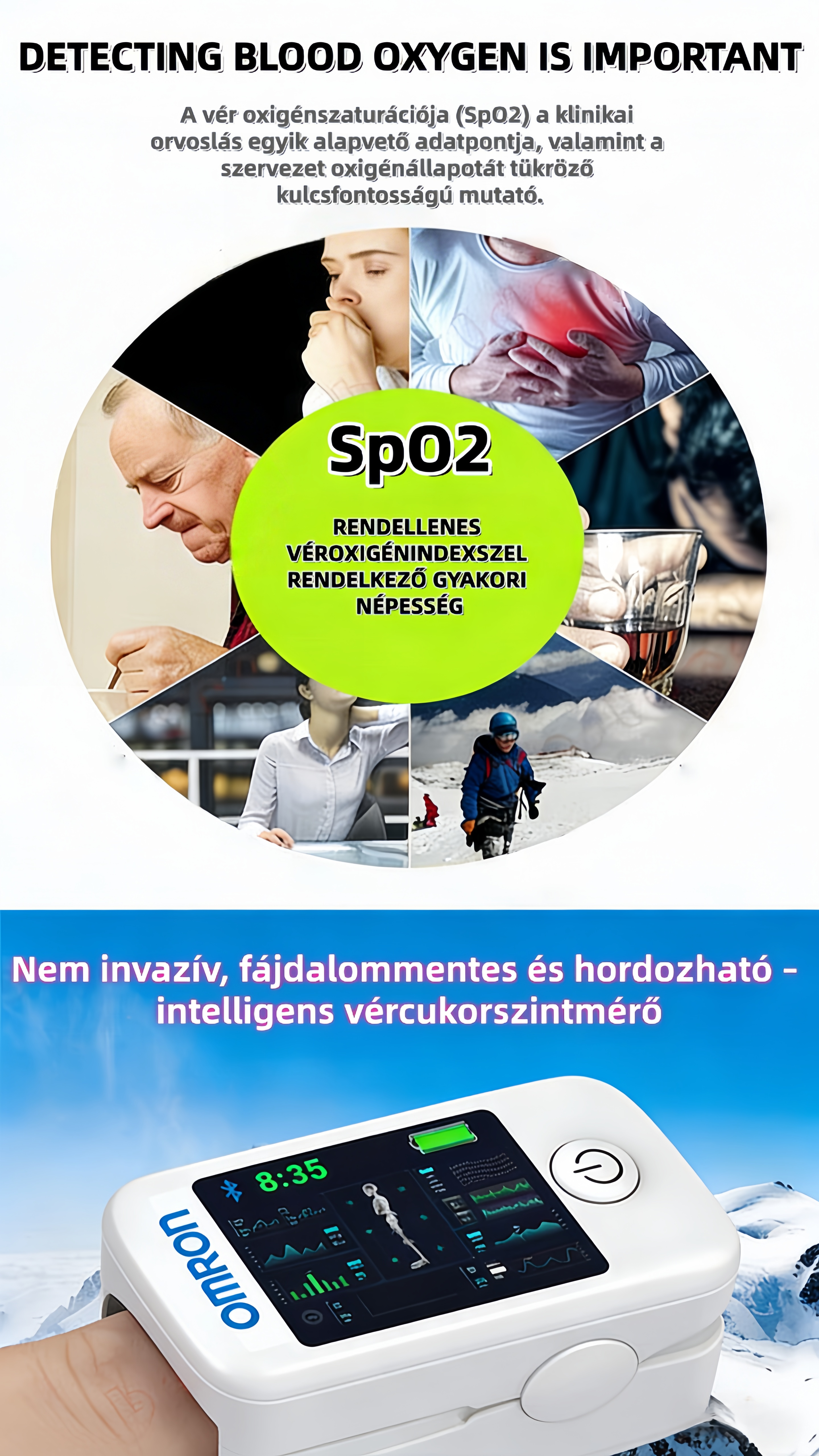 A vér oxigénszintjének rendszeres ellenőrzése segíthet gyorsan észlelni a szervezet hipoxiáját. Az oxigénhiánynak számos oka lehet, beleértve a légúti betegségeket (például COPD, asztmát, tüdőgyulladást stb.) vagy szívproblémákat. A hipoxia korai felismerése lehetővé teszi a megfelelő időben történő beavatkozást a súlyos következmények elkerülése érdekében. Ugyanakkor a tüdő működése a vér oxigéntartalmán keresztül is nyomon követhető.